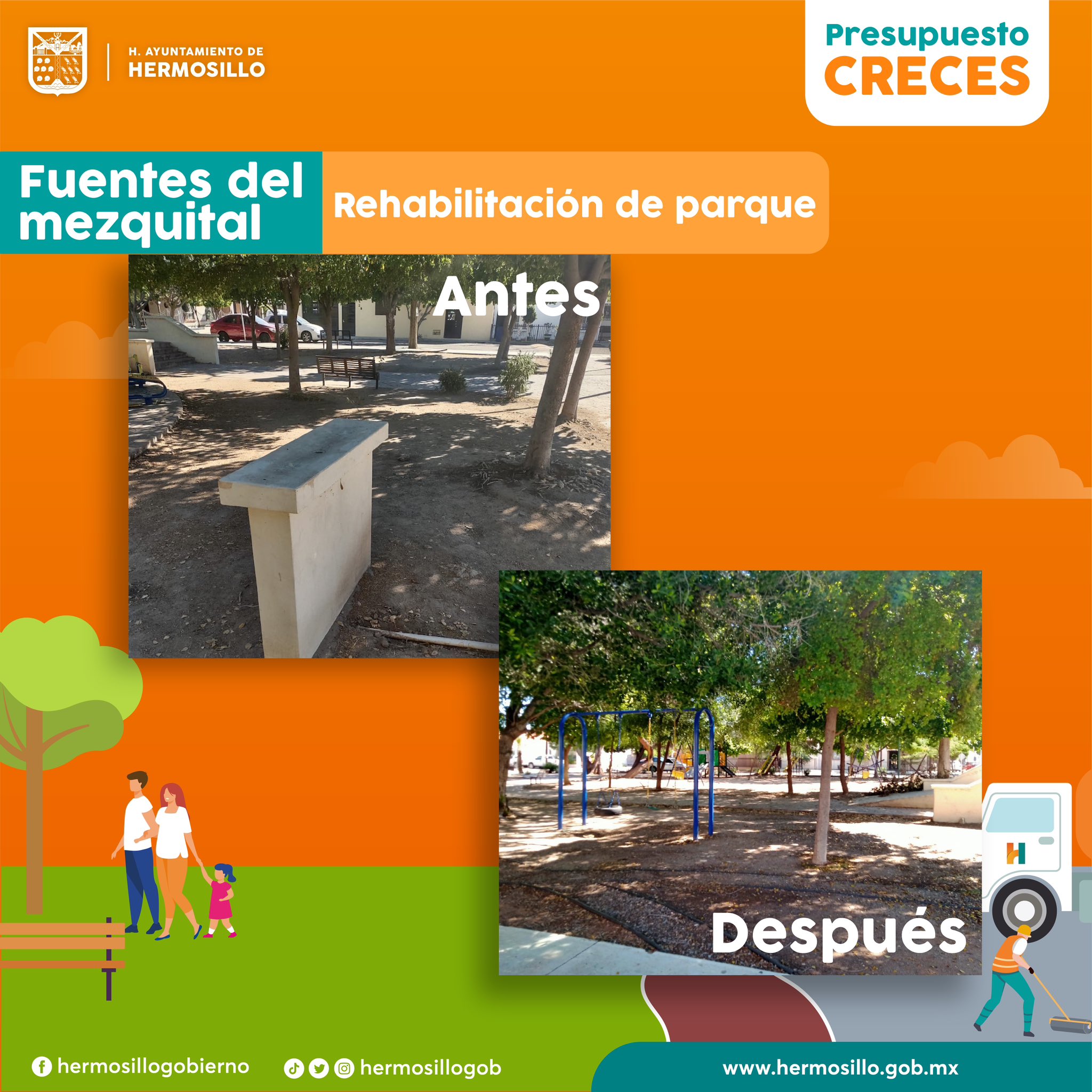 Intervención en 20 espacios públicos, impactando a más de 85,672 habitantes con actividades de rehabilitación y limpieza de camellones, banquetas, así como plantación de árboles; acciones que mejoran el entorno, disminuyen la contaminación y provocan su apropiación. Colonias tales como: Los Ángeles, Ladrilleras, La Cholla, Las Lomas, Los Encinos, Altares, Nuevo Hermosillo, Insurgentes, Solidaridad, Puerta Real, y Pueblitos pueden disfrutar en familia de espacios públicos más seguros y practicar algún deporte y/o actividad recreativa. Con ello se alcanza un total 172 parques rescatados bajo la implementación del programa en esta administración.